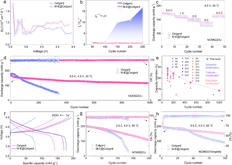 为了验证改性隔膜对锂离子传输的影响,我们进行了GITT测量。如图4a所示,当电池电压在3.6-4.0 V范围内时,两种电池显示出相似的离子扩散系数,而当电压超过4.0 V时,改性电池的离子扩散系数略微增加,表明M-E@Celgard对锂离子扩散具有正向促进作用。通过电化学阻抗谱分析,我们发现在电池循环过程中,Celgard基电池的固体电解质界面(SEI)电阻率持续增加,而改性电池由于有效抑制了串扰效应,SEI的电阻率几乎没有变化(图4b)。在全电池电化学性能测试中,由改性隔膜组装的4.5 V NCM622//Li电池表现出了优异的倍率性能和长循环性能(图4c-e)。与之相比,Celgard基电池表现出了快速的容量衰减和严重的电极极化现象(图4f)。此外,即使在高温环境下,NCM622//Li和NCM622//石墨电池依然保持着出色的稳定性(图4g,h)。