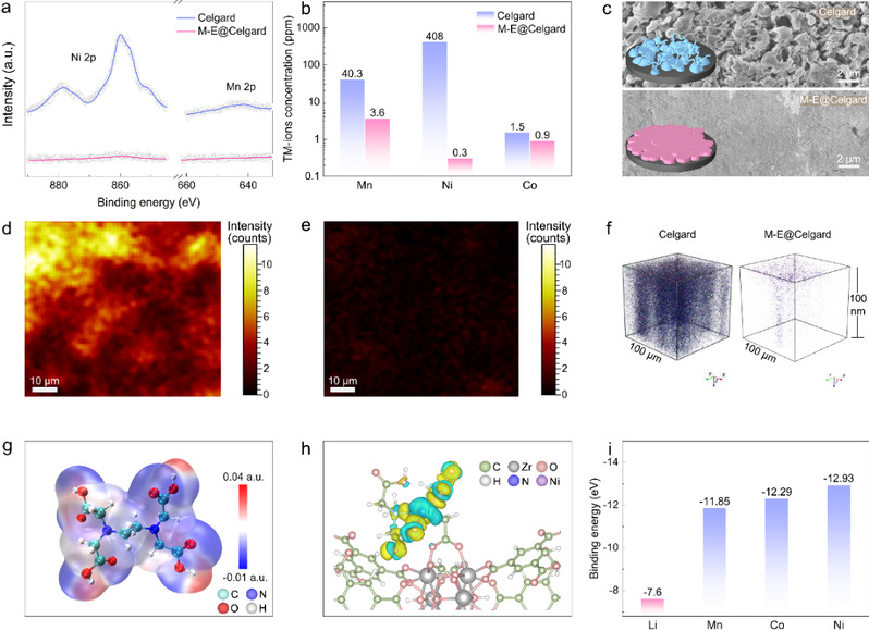 图5.(a)循环后负极表面Ni/Mn 2p 的XPS图谱。(b)循环后锂负极上Mn/Ni/Co元素的含量。(c)不同隔膜电池循环后负极形貌图像。使用Celgard隔膜(d)和M-E@Celgard隔膜(e)循环后锂负极表面的TOF-SIMS(Ni离子碎片)图像。(f)基于c和e中Ni离子碎片的三维重构图像。(g)EDTA分子的静电势分布。(h)M-E碎片和Ni离子的局部电荷密度分布。(i)M-E骨架与不同离子的结合能。@Wiley