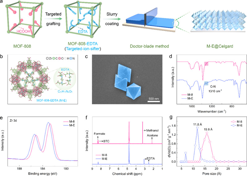 图2.(a)M-E@Celgard的制备流程示意图。(b)M-E的分子结构示意图。(c)M-E的SEM图像。(d)接枝前后的红外光谱数据。(e)M-E和M-8的Zr 3d XPS图谱。(f)接枝前后的1H NMR光谱。(g)M-E和M-8的孔径分布。@Wiley