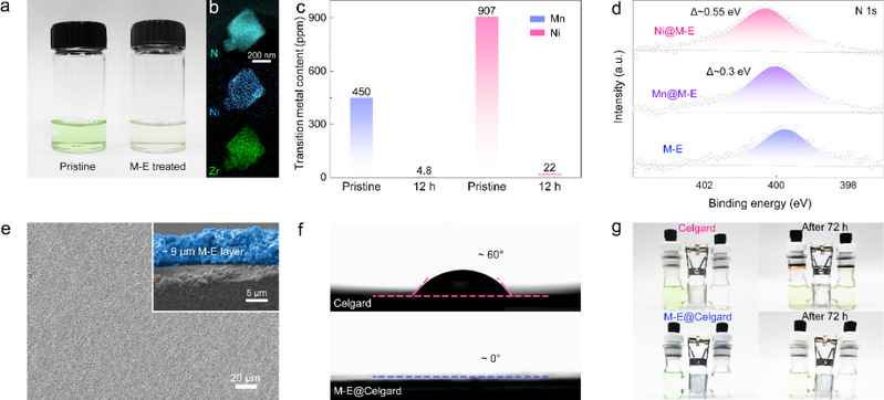 图3.(a)M-E对电解液中Ni离子的吸附测试。(b)Ni@M-E的元素分布图。(c)含有Mn(Ni)离子的电解液在M-E吸附前后的元素含量变化。(d)吸附Mn(Ni)离子后材料的N 1s XPS光谱。(e)改性隔膜的俯视和截面电镜图。(f)不同隔膜的电解液浸润性测试。(g)不同隔膜对过渡金属离子的阻隔测试。@Wiley