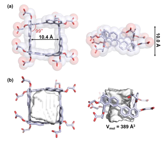 晶体结构表明,RRRR-C[4]BINOL采用四棱柱状管状构象,腔宽为10.4 Å。此外,空腔深度约为10.0 Å,空腔体积估计约为389 Å3(图 1b),也接近葫芦脲[8]的空腔体积(CB[8])。值得注意的是,尽管C[4]BINOL和CB[8]的空腔深度和体积相当,但它们的空腔特性表现出明显的差异。C[4]BINOL的空腔在形状和刚性方面与 CB[8]不同,由富电子芳环组成,而CB[8]的上下边缘由极性羰基组成,使得空腔仅在中间区域具有疏水性。相比之下,C[4]BINOL的上下边缘缺乏极性基团,使得整个空腔具有疏水性。深层疏水空腔的这种特性预计会引起强烈的疏水效应,从而表现出对疏水客体分子的高亲和力。
