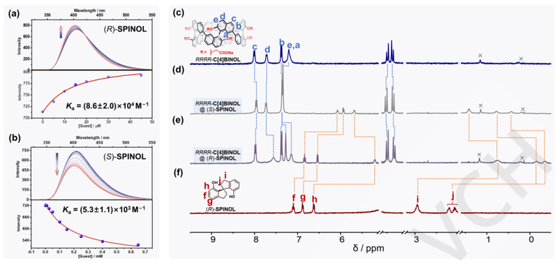 图4 (a) RRRR-C[4]BINOL 和 (R)-SPINOL 对,(b) RRRR-C[4]BINOL 和 (S)-SPINOL 对的荧光滴定和相关滴定曲线;(c) D2O (1 mM) 中的 RRRR-C[4]BINOL、(d) D2O (1 mM) 中的 RRRR-C[4]BINOL@(S)-SPINOL 复合物的 1H NMR 谱 (400 MHz, 298K) , (e) D2O (1 mM) 中的 RRRR-C[4]BINOL@(R)SPINOL 复合物,(f) CD3OD:D2O (1:9) 混合溶剂 (1 mM) 中的 (R)-SPINOL