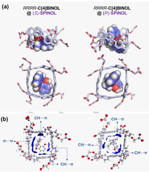为了更深入地了解C[4]BINOL所表现出的高对映选择性,使用(S)-和(R)-SPINOL作为模型手性客体来探索结合模式和对映选择性识别机制,采用核磁氢谱、荧光光谱和DFT理论计算相结合,结果进一步证实了SPINOL两个手性对映体与C[4]BINOL有着两种截然不同的结合模式,从而解释了高对映选择性的来源。