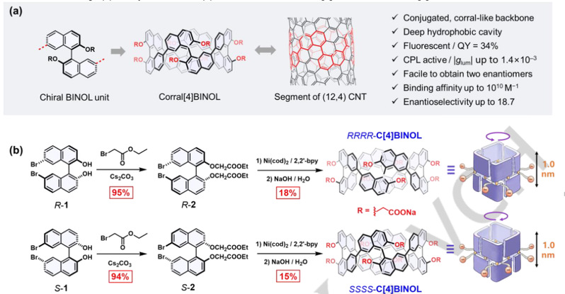 本文中,作者使用手性1,1′-联-2,2′-萘酚(BINOL)衍生物作为构筑单元合成了一种水溶性共轭管状大环(Corral[4]BINOL,方案1)。共轭手性主链赋予Corral[4]BINOL在水中良好的荧光发射(QY=34%)和圆偏振发光(|glum|高达1.4×10–3)。特别是Corral[4]BINOL对水中的非手性客体表现出高达8.6×1010 M−1的高识别亲和力,并对手性底物表现出高达18.7的优异对映选择性。