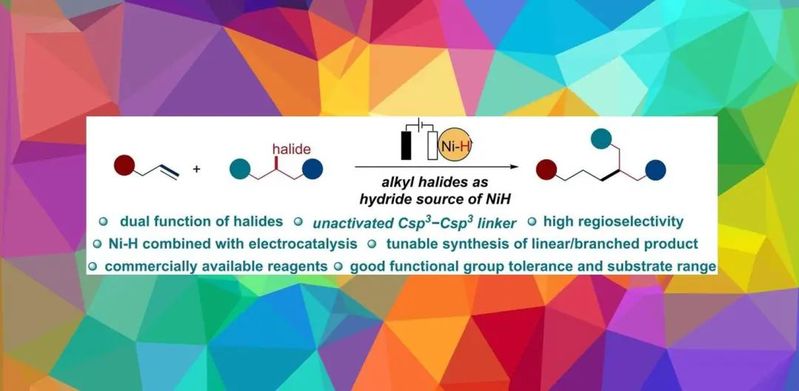 英国365公司官网元素有机化学国家重点实验室仇友爱课题组聚焦于有机电化学的研究,特别是亲电试剂的电化学还原交叉偶联(Angew. Chem. Int. Ed. 2023, e202306679),基于课题组前期以及电化学还原羧化、电化学还原氘化的工作(Angew. Chem. Int. Ed. 2022, 61, e202207746;Angew. Chem. Int. Ed. 2023, 62, e202214710,Nat. Commun. 2022, 13, 3774)。近日,英国上市公司365仇友爱和南京大学王敏燕课题组联合报道了电化学条件下Ni-H催化的烷基卤化物和烷基烯烃的交叉偶联反应。反应有以下特点:a)卤化物同时作为偶联底物和氢源;b)可以避免使用硅烷作为氢源以及添加还原性金属试剂;c)良好的化学选择性和区域选择性,可以实现线性和支链偶联产物的可调合成;d)底物范围广,对一些天然产物和药物分子也表现出良好的耐受性。
