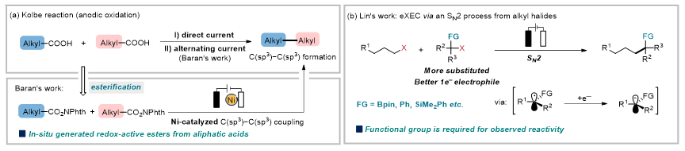 在过去的几十年中,有机电催化已发展成一种可以解决过去难以解决的问题有的效方法。最近,Baran课题组实现了交流电催化的Kolbe反应(图1a)和氧化还原活性酯(RAE)与过渡金属催化剂镍在还原条件下的脱羧交叉偶联这两种新型的构建Csp3–Csp3键的方法。另外,林松组报道了在电化学条件下使用两种不同烷基卤化物在无过渡金属条件下通过SN2过程构建Csp3–Csp3键的反应(e-XEC)(图1b)。但底物中必要的活化基团(Bpin、Ph、SiMe2Ph)限制了这种方法在合成化学中的广泛应用。