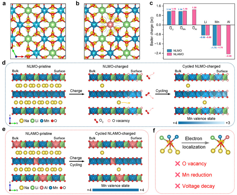 差分电荷密度计算结果表明,Al的引入影响了相邻氧原子的电荷分布(图5a,b)。NLAMO中与Al相邻的氧原子周围出现更多的电荷,即电子定域于氧原子周围。Bader电荷分析进一步表明NLAMO中O原子周围的平均电荷比NLMO的更负,证实Al的定域效应(图5c)。图5d清楚展示了NLMO电压衰减的原因。由于充电过程中氧的不可逆损失,氧空位首先在颗粒表面形成,在随后的电化学循环过程中,氧空位逐步往体相生成。在充电状态下,氧空位周围的Mn4+倾向于被还原,从而在表面形成Mn3+。同时,随着氧空位的积累,Mn价态从体相到表面呈现+4到+3的梯度分布,最终导致氧化还原反应的非均质性,从而引起明显的电压衰减。