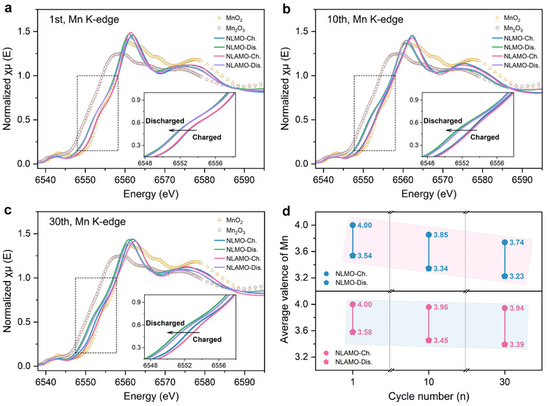 图4. Mn的平均价态。NLMO和NLAMO在(a)第1、(b)第10和(c)第30周循环后的归一化Mn K边XANES谱图。(d)NLMO和NLAMO在不同电化学状态下Mn平均价态的定量化结果。