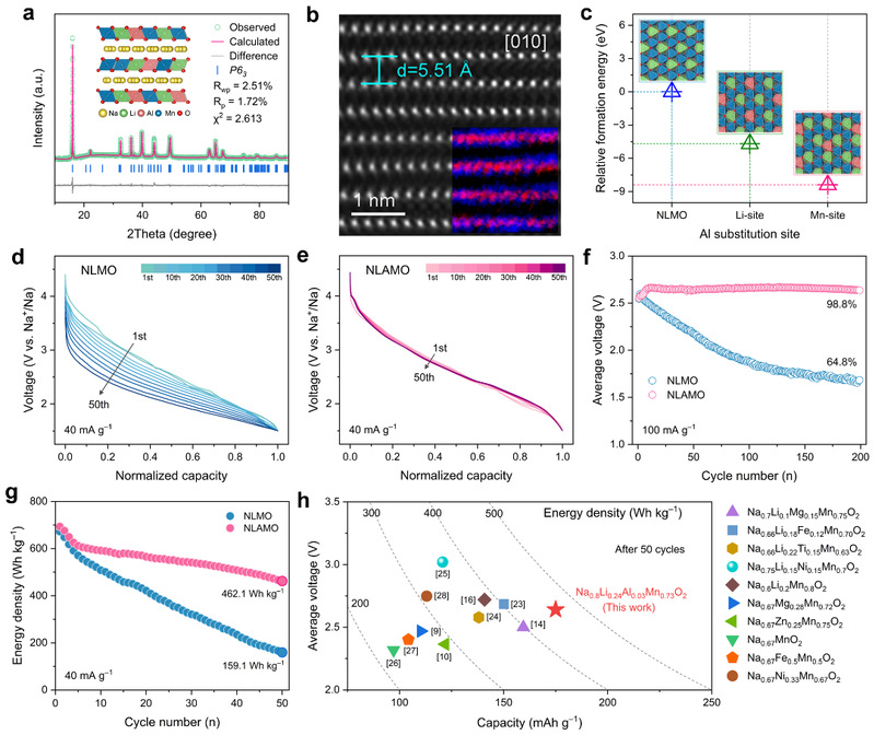 研究团队首先采用固相法制备了Na0.8Li0.24Mn0.76O2(NLMO)和Al取代的Na0.8Li0.24Al0.03Mn0.73O2(NLAMO)。NLAMO材料XRD的Rietveld精修谱图表明其为具有蜂窝状超晶格的P2相层状结构(图1a)。NLAMO的HAADF-STEM图像显示,MO2层与Na层交替存在,相邻MO2层间距为5.51 Å,符合P2相层状结构(图1b)。相对形成能计算结果表明,Al原子倾向于占据过渡金属层Mn位点而不是Li位点(图1c)。在低倍率50周电池循环过程中,NLMO展示出明显的放电电压衰减现象,而NLAMO的放电电压基本不发生衰减(图1d,e)。此外,NLAMO在高倍率200周循环后,其放电电压依然可以很好地保持(图1f)。得益于电压的保持,NLAMO在50周循环后仍具有462.1 Wh kg−1的高能量密度(图1g),明显优于其它已报道的钠离子电池层状正极材料(图1h)。