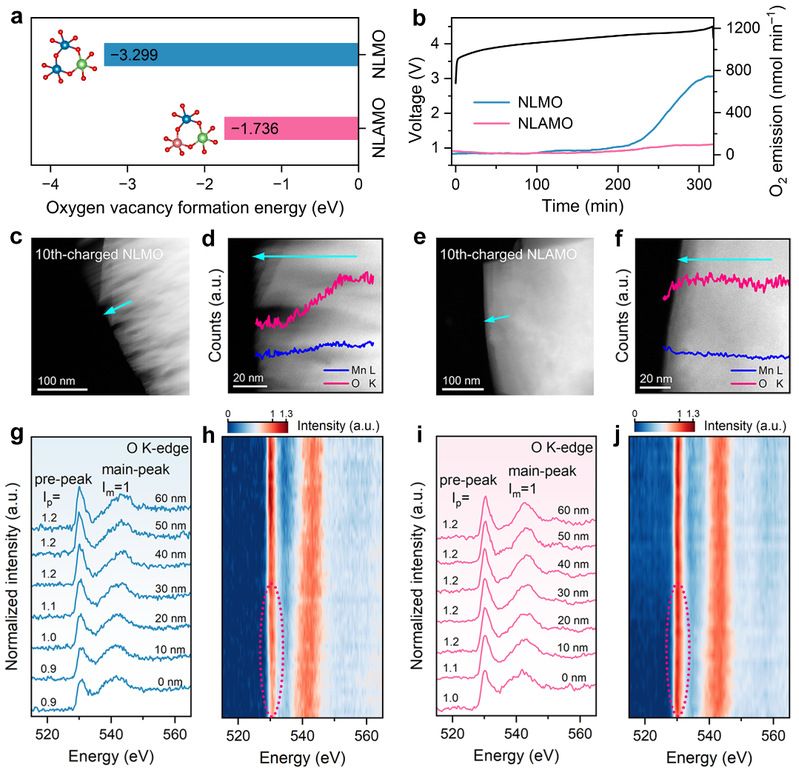 图2. NLMO和NLAMO的氧氧化行为。(a)氧空位形成能。(b)原位DEMS谱图。第10周充电态NLMO的(c)STEM图像和(d)EELS定量曲线。第10周充电态NLAMO的(e)STEM图像和(f)EELS定量曲线。第10周充电态(g,h)NLMO和(i,j)NLAMO的O K边EELS谱图。