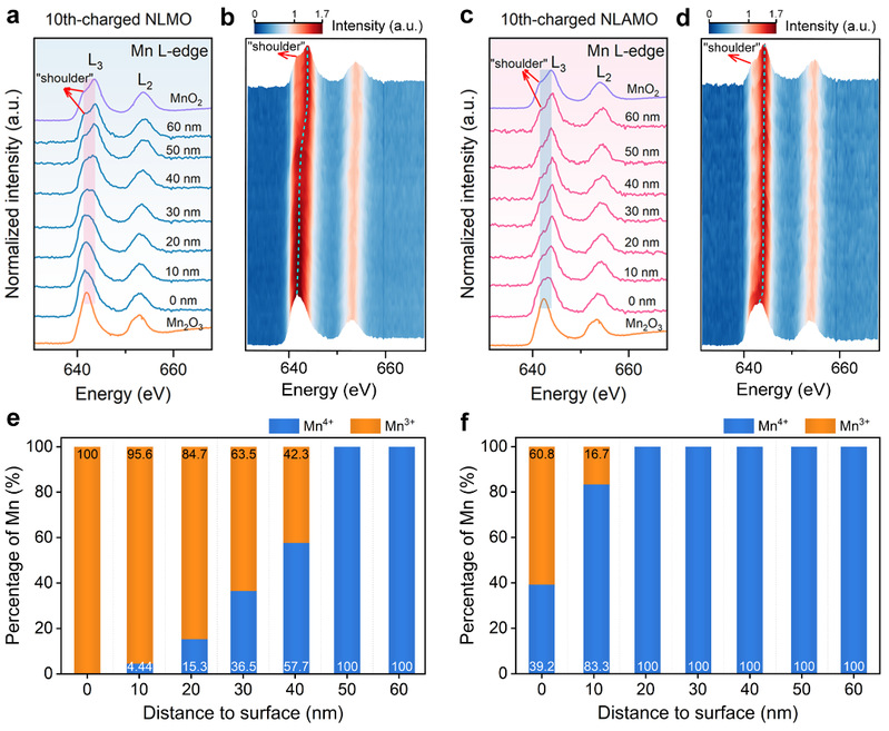 对于第10周充电态的NLMO,从体相到表面,Mn L3边肩峰逐渐变宽并转化为主峰,说明表面Mn4+还原为了Mn3+(图3a,b)。而第10周充电态的NLAMO从体相到表面的Mn L3边的能量位置和形状并没有显著差异,表明其颗粒Mn4+分布较为均匀(图3c,d)。进一步定量结果表明,第10周充电态的NLMO从体相到表面,Mn的价态呈现+4到+3的梯度分布(图3e)。而第10周充电态的NLAMO,除最表面外,Mn的价态基本维持在+4价(图3f)。