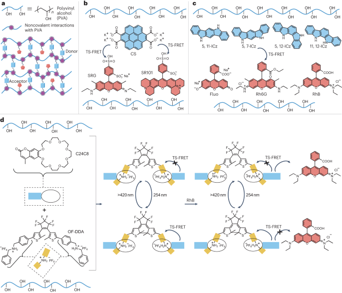聚合物介导的固态超分子组装:水溶性PVA含有多个侧羟基官能团,可通过离子-偶极或氢键相互作用等非共价相互作用直接与荧光粉组装,形成基于PVA的固态超分子结构。(图2a)从该策略中衍生出一系列具有长磷光寿命和高磷光量子产率的纯有机PRET体系。通过分子工程在荧光粉中引入双相互作用位点,可以与PVA特异性相互作用以增加其静电吸引力,也可用于构建有机超长PRET体系。另外,PVA在制备固体超分子PRET体系时对水溶性荧光粉具有相当大的限制作用,而大多数不溶于水的磷光供体更倾向于与有机相聚合物基质(如PMMA、半结晶间规聚苯乙烯(sPS)和PVP)共组装,以形成无定形的纯有机PRET体系。