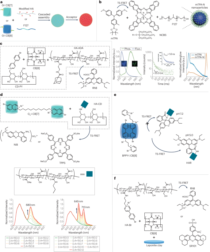 与用于 PRET 的固体磷光超分子不同,水介质中的三重态更容易被水分子和溶解氧淬灭。因此,荧光粉应与水和分子氧隔离,同时,供体-受体基团应保持有序的空间组织,以减少潜在的能量损失。目前,在水溶液中运行的 PRET 体系是将荧光粉与 CB[n] (n = 7、8)、α-/β-CD 等大环化合物以及 SC4A[n] (n = 4、6 或 12)和三嵌段共聚物 F127 等两亲分子共同组装形成的,它们具有协同的疏水屏蔽和约束刚性效应,同时还能负载荧光染料以进行 PRET 过程,在生物医学成像方面具有巨大的应用潜力。