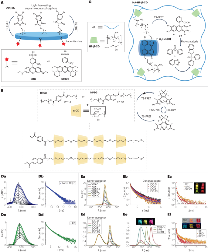 超分子水凝胶是含有大量水的三维交联体系,由聚合物通过非共价相互作用组成。与溶液相比,磷光分子可直接参与凝胶形成,可固定分子,有效分离氧等淬灭剂。研究表明,超分子水凝胶可以作为磷光的新基质,进而帮助磷光分子的能量转移,这对软材料的进一步发展具有重要意义。水凝胶中的PRET体系是以LP作为锚定荧光粉的支架或与丙烯酰胺共聚的原位荧光粉开发的。两种方法均能提供受限微环境,使供体-受体分子的有序组装经历PRET反应,用于促进光催化交叉偶联反应和长寿命多色发光软材料。