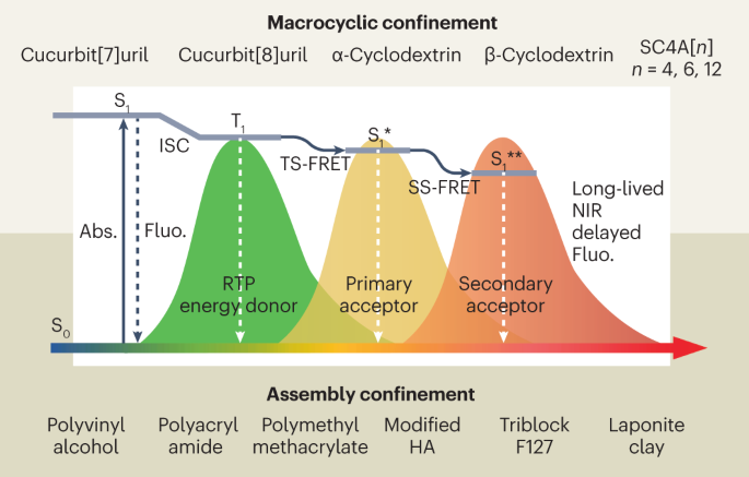 基于聚合物的共组装:另一种可行的组装限制策略是与G⊂CB[7]或G⊂CB[8]配合物进行聚合物基共组装,通过创造具有有限分子振动的刚性环境来降低三重态非辐射衰减率。因此,一些水溶性聚合物如F127和HA被用作组装单元,通过静电和疏水相互作用等非共价相互作用在水溶液中诱导超分子自组装,从而改善RTP发射。