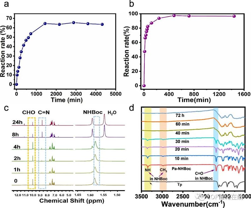 Figure 3. (a, b) Reaction rate of reactions a and b over time, respectively. (c) 1H NMR spectra of reaction a over time. (d) FT-IR spectra of experiment 3 over time.