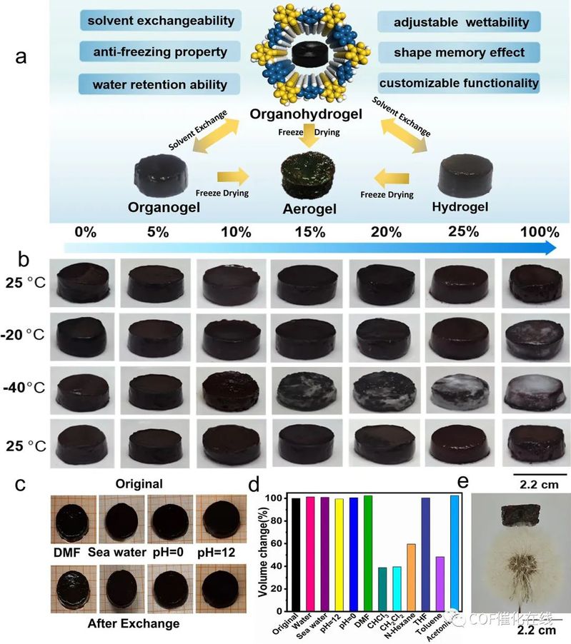 Figure 6. (a) The transformation between COF organohydrogels, COF hydrogels, COF organogels, and COF aerogels and advantages of COF organohydrogels. (b) The effect of water volume percentage (vol %) on the antifreezing performance of TpPa COF gels. (c) Swelling exhibitions of COF gels in different solvents after swelling for 3 days. (d) The swelling ratio of TpPa COF gels in various solvents. (e) Photographs of COF aerogels on the tomenta of a dandelion.