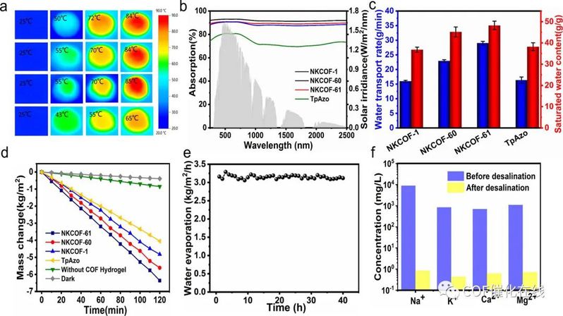 Figure 7. (a) Solar thermal images of different COF gels before and after 1 sun irradiation. (b) UV–vis–NIR absorption spectra of different COF gels. (c) Water transport rate and saturated water of different COF gels. (d) Mass change of pure water of different COF gels upon 1 sunlight irradiation (1 kW/m2). (e) Stability evaporation test applying pure water of NKCOF-61 gels over 40 h. (f) Ion concentration of water before and after desalination.