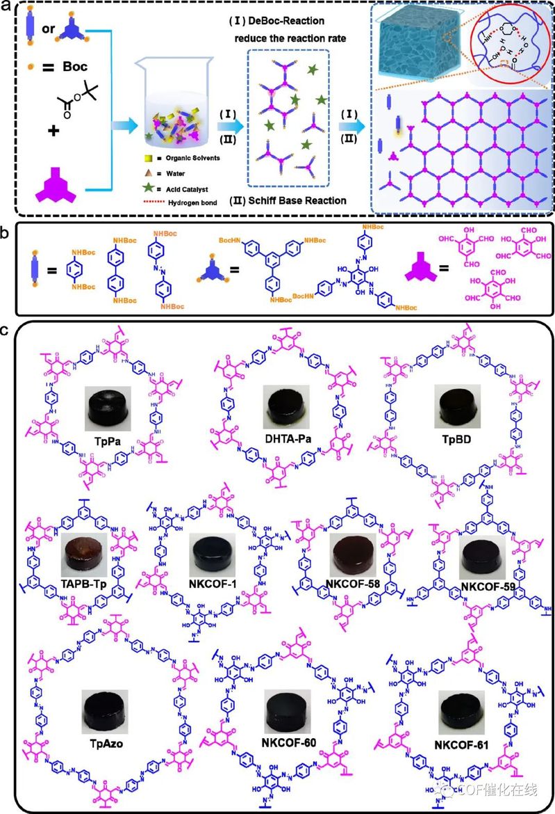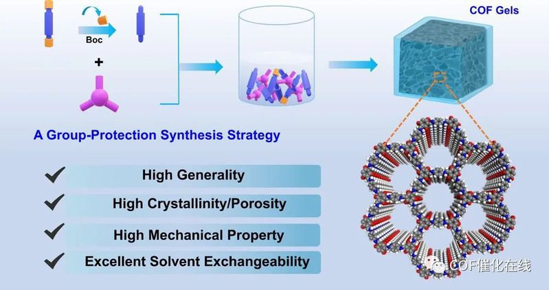 将不溶解和不熔融的多孔材料制备成凝胶,以应用于先进技术,具有重要意义但也面临巨大挑战。在这里,作者提出了一种通用、简便且可扩展的方法,利用基团保护合成策略制备共价有机框架(COF)凝胶。为验证该策略的普适性,我们成功制备了10种高结晶性、多孔性、机械性能良好、对溶剂和冻结具有优异抵抗能力的COF有机水凝胶。值得注意的是,这些COF有机水凝胶可以轻松转变为水凝胶、有机凝胶和气凝胶,消除了不同类型COF凝胶之间的差距。深入的机理研究揭示了基团保护策略有效减缓了COF的形成速率并调控了其形态,有利于形成交联的纳米纤维/纳米片,从而产生COF凝胶。作者还发现,在有机/水二元溶剂和COF骨架中的功能基团形成的氢键网络在创建有机水凝胶以及保持抗冻和溶剂抵抗性方面起着至关重要的作用。作为应用演示,携带光响应偶氮苯基团的COF凝胶显示出优异的太阳能吸收、光热转换和水传输性能,在太阳能海水淡化中具有巨大潜力。该工作丰富了COF凝胶的合成工具箱,并扩展了COF的应用范围。