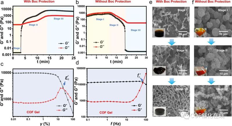 Figure 4. (a, b) Oscillatory time sweep profile of COF gel (a) and COF powder (b) formation in situ (under 120 °C). (c) Strain sweep γ measurements of the COF gels. (d) Frequency sweep f measurements of the COF gels. (e, f) SEM images of the COF gels (e) and COF powders (f) corresponding to each formation stage over time (inset: visual aspect).