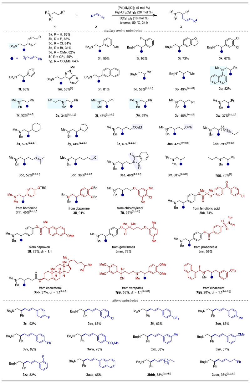 基于此设想,作者使用N,N-二苄基-2-苯乙胺和1-苯基联烯作为模板底物进行了条件筛选,结果表明烯丙基化反应可以在B(C6F5)3与Pd催化剂协同催化下进行。其中,P(p-CF3C6H4)3配体对于反应活性至关重要,吸电子的三氟甲基通过诱导效应增强了烯丙基钯的亲电性。该反应具有良好的区域选择性以及底物范围,不仅能够兼容各种取代的三烷基胺以及芳基烷基取代的联烯,底物中含有酯基、醚键、炔基、烯基、卤素、酰胺等官能团也能够较好地反应。此外,该方法适用于天然产物和药物分子的后期官能团化修饰(如图2)。
