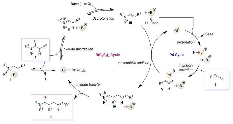 随后,作者进行了克级实验、产物转化实验、机理实验,并提出了反应可能的机理(如图3)。在反应过程中,B(C6F5)3催化三烷基胺脱氢生成烯胺Ⅲ,Pd(0)被质子化形成Pd-H;Pd-H对联烯迁移插入,生成烯丙基钯中间体V;烯胺对烯丙基钯中间体进行亲核进攻,得到亚胺正离子IV;亚胺正离子被[B(C6F5)3-H]-还原,生成烯丙基化产物,同时再生催化剂。脱氢产生的负氢和质子分别由B(C6F5)3和钯催化剂转移到产物中,表现出优异的原子经济性。动力学实验表明,Pd(0)被质子化形成Pd-H的过程可能是反应的限速步。