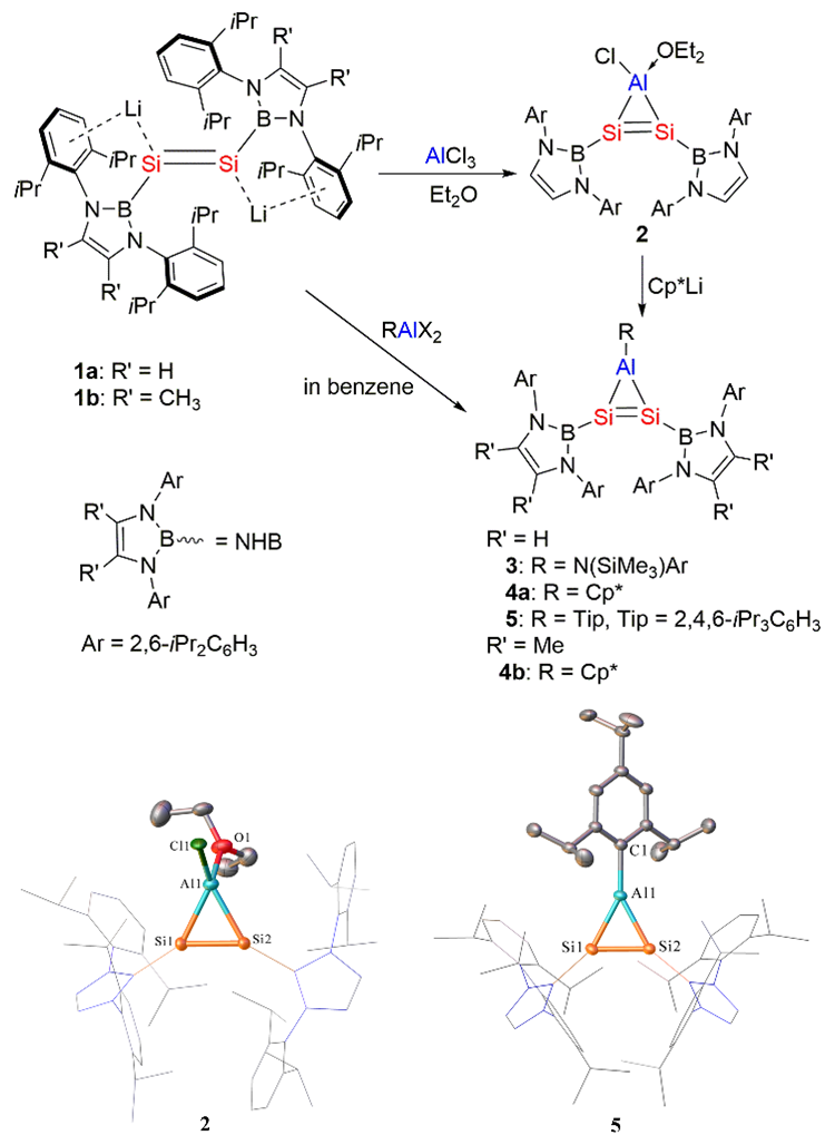 图1. AlSi2环丙烯化合物2-5的合成及2、5的晶体结构