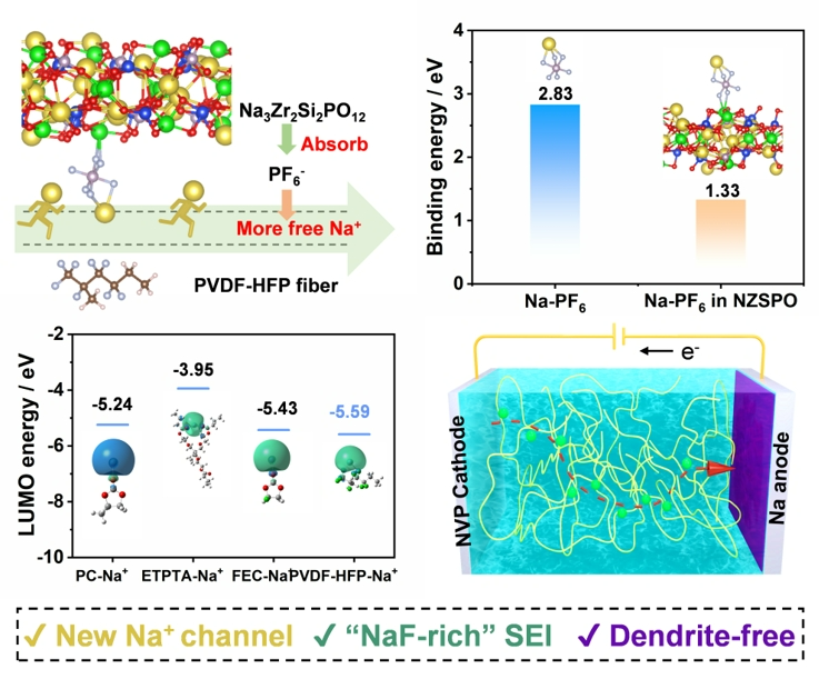 通过静电纺丝制备了NZSP/PVDF-HFP功能性电纺膜,通过XRD、FTIR、23Na固态核磁和DFT计算,证明其有机-无机界面实现了稳定且快速的Na+传导,有效缓解了液态电解质和聚合物链段中Na+传输不均匀的问题,也进一步增强了准固态电解质的离子电导率。