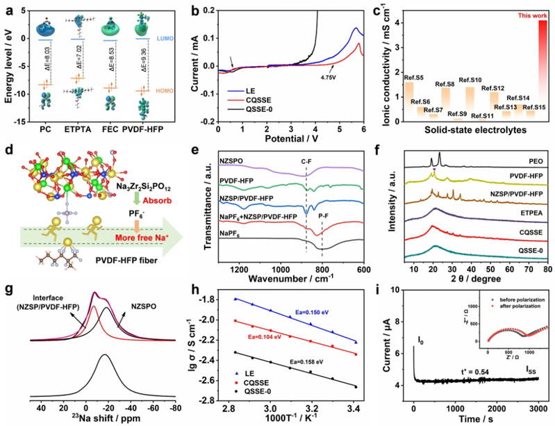 图 2. a) 分子的HOMO和LUMO能级比较。b) LE、CQSSE和QSSE-0的LSV图。c) CQSSE 与已报道的固态电解质的离子电导率比较。d) 有机-无机界面机理分析图。e) 不同物质的FTIR和 f) XRD 图。g) NZSPO和NZSP/PVDF-HFP的23Na NMR谱。h) CQSSE电解质在20至 80 °C范围内的σ线性拟合图。i) Na|QSSE-0|Na电池的离子迁移数测试。