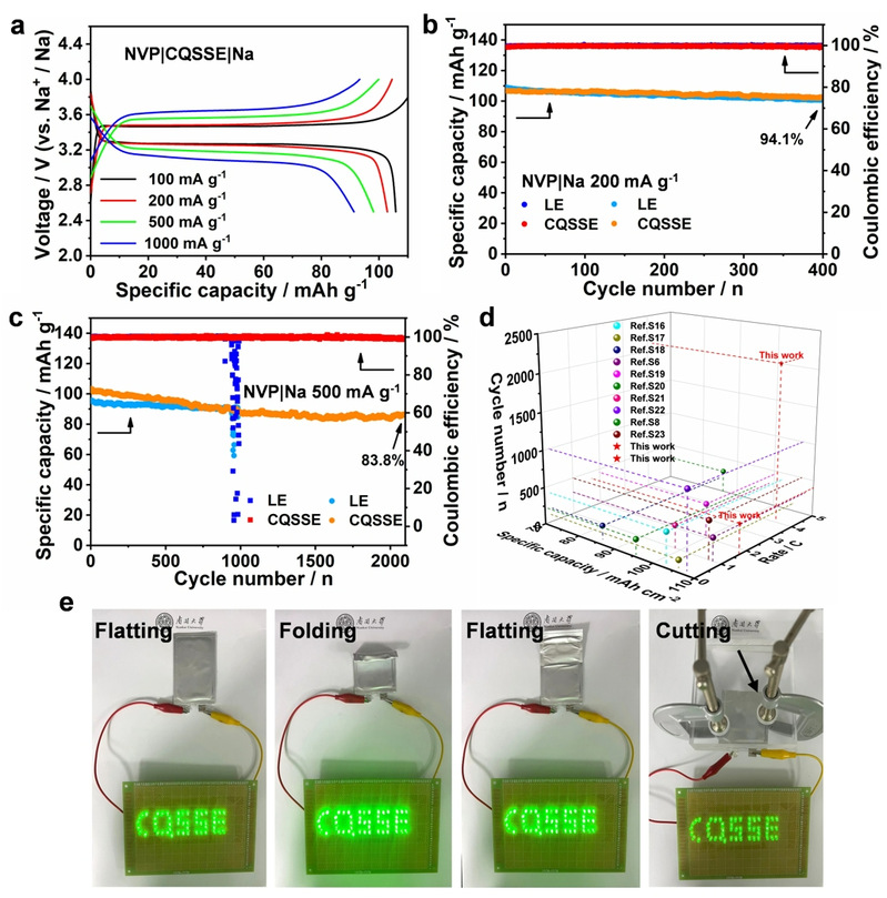 图 5. NVP|CQSSE|Na电池:a) 恒流充放电曲线,b) 200 mA g-1的循环性能,c) 500 mA g-1的长循环。d)与报道的固态电解质全电池的循环性能比较。e) 软包电池在压扁、折叠、压扁、切割状态下的破坏状态测试。