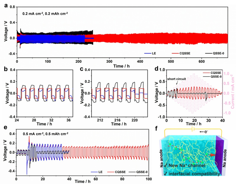 图 3. a) 电流密度和容为0.2 mA cm-2和0.2 mAh cm-2时钠金属电镀/剥离的电压-时间曲线。b) 24-37 h和c) 211-224 h处的局部放大电压-时间曲线。d)钠对称电池在0.05 至1.0 mA cm-2 的不同电流密度下的倍率性能。e) 0.5 mA cm-2 和0.5 mAh cm−2下钠金属电镀/剥离的电压-时间曲线。F) Na|CQSSE|Na 的机理示意图。