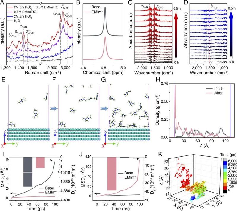 图2. 不同电解液的(A)拉曼光谱及其(B)1H核磁共振谱图。(C) 不同电解液中收集的Zn电极表面原位傅立叶变换红外光谱。EMIm+阳离子在充电(E)开始前、(F)过程中和(G)结束时电极附近分子分布的分子动力学模拟。(H) 充电前后锌表面附近的密度分布曲线。Zn2+在电极上的均方位移和扩散系数在(I)垂直方向和(J)平行方向上的情况。(K) 在穿越EMIm+富集区域时,Zn2+传输路径的模拟。