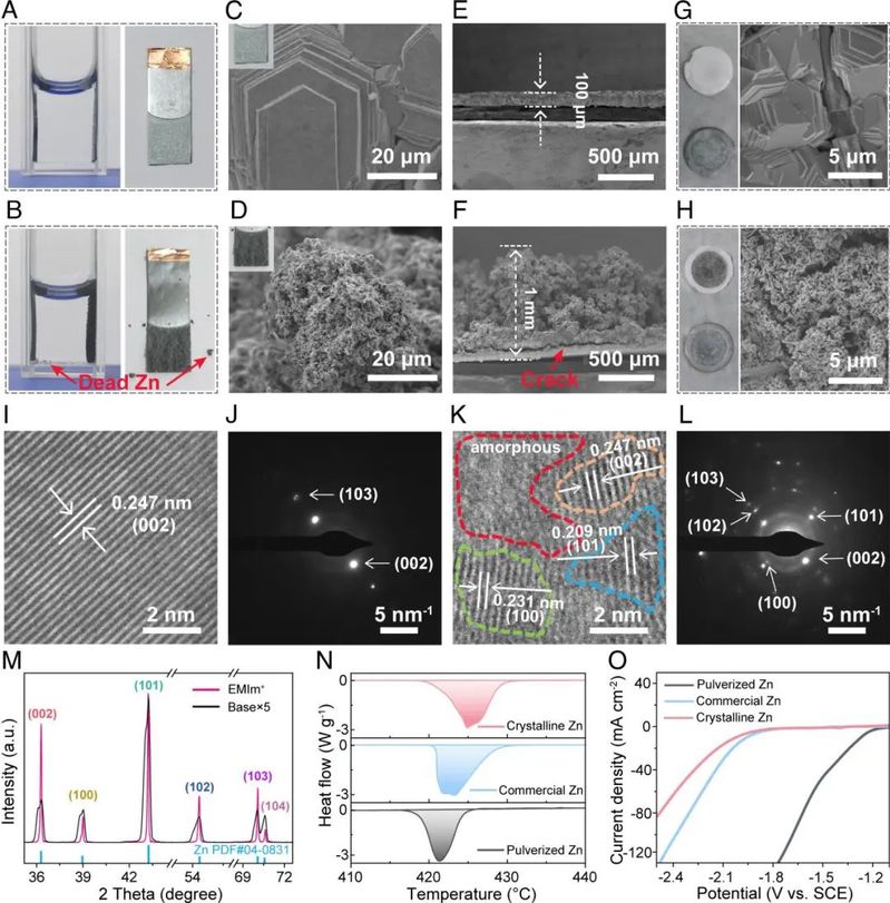 图3. 在一个石英池中,使用不同电解质沉积的锌的照片(A) 2M Zn(TfO)2 + 0.5M EMImTfO 与(B)2M Zn(TfO)2及其相应的(C和D)顶视图和(E和F)横截面SEM图像。扣式电池在不同电解液(G)2M Zn(TfO)2 + 0.5M EMImTfO 与(H)2M Zn(TfO)2)中经过一次充放电循环后的隔膜和锌电极的照片以及相应SEM图像。在电解质(I和J)2M Zn(TfO)2 + 0.5M EMImTfO和(K和L)2M Zn(TfO)2中沉积的锌的HRTEM图和SAED表征。(M)不同电解质中沉积的锌的XRD表征。(N)在不同电解质和商用Zn箔作为标准的DSC曲线。(O)不同锌电极析氢对应的极化曲线,扫描速率为0.5毫伏/秒。