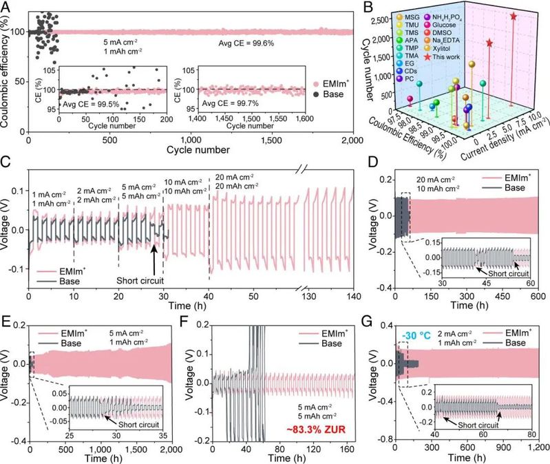 图4. (A) 在不同电解液中Zn||Cu电池的库仑效率。(B) 本研究与其他电解液优化策略的比较。(C) 测量不同电流密度和容量下操作的对称电池的倍率性能。对称电池在(D) 20 mA cm-2 and 10 mAh cm-2;(E) 5 mA cm-2 and 1 mAh cm-2;(F) 5 mA cm-2 and 5 mAh cm-2;(G) 2 mA cm-2 and 1 mAh cm-2的电流条件下,在不同电解液中进行恒电流循环测试。