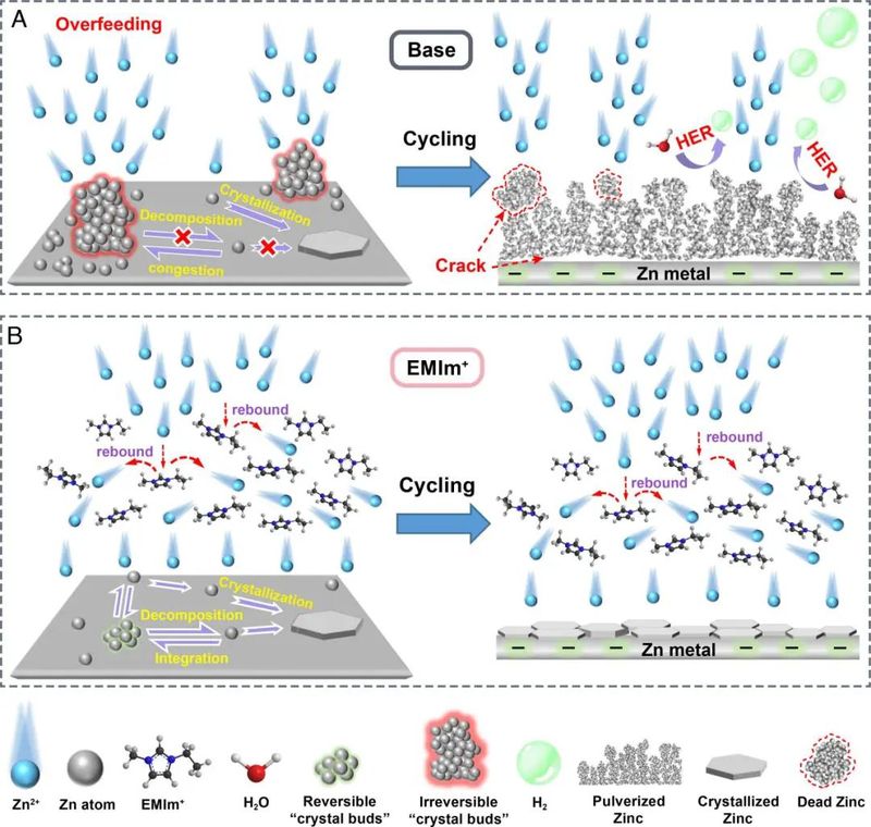 图1. (A)粉化锌形成的起源和危害以及(B)通过添加EMIm+作为3DIC缓冲层来抑制粉化的机制的示意图。