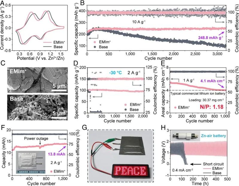 图5. (A) 在扫描速率为0.2 mV s−1时,Zn||KVOH全电池的循环伏安图。(B) 在10 A g-1时全电池的循环性能。(C) 在2 M Zn(TfO)2中以10 A g-1速率循环500次后的Zn阳极的SEM图像。(D) 在-30°C的低温条件下以2 A g-1的电流密度工作的全电池性能。(E) 在1.18的低N/P比和高KVOH负载下,使用含EMIm+的电解质以1 A g-1的电流密度工作的循环性能。(F) 在2 A g-1的电流密度下使用含EMIm+的电解质的软包电池的循环性能。(G) 点亮LED灯的照片。(H) 在不同电解液中Zn-空气电池的循环性能。