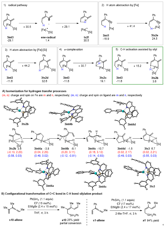 该反应中的C‒H键活化模式与文献报道的模式都不一样,硅基不仅协助了C‒H键活化过程,显著降低了该过程的能垒,并最终转化成底物的一部分(图5)。研究者将上述C‒H键活化模式称为“底物协助的C‒H键活化”。完成氢原子转移还需经历低价铁介导的异构化过程,深入分析这一异构化过程发现其具有显著的“自旋离域调控的反应性”,即催化剂通过自旋交叉以及金属与配体间的自旋离域动态调节金属中心的自旋态和氧化态,从而加速氧化加成与还原消除这两个电性需求相反的基元反应。该过程建议的联烯中间体被合成出来,在反应条件下得到预期的C(sp3)‒H硅化的产物,支持了上述途径。