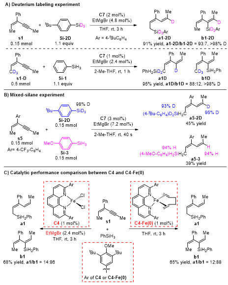 同位素标记实验表明,加成到C≡C键上的两个氢原子分别来自Si‒H和烯丙位C‒H(图3A)。混合硅烷实验排除了Fe‒H或Fe‒Si物种启动的反应机理,并支持(形式上)零价铁物种启动的两电子氧化还原机理(图3B)。研究者还制备了(形式上)零价铁活性配合物,并验证了其催化效果与原位还原体系一致,进一步支持上述机理(图3C)。