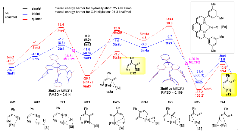 研究者提出了反应的可能机理(图4):二价铁前体催化剂在乙基格氏试剂的作用下被还原为零价铁活性物种并与共轭烯炔底物配位生成int1,int1再与硅烷配位生成int2,随后经ts1发生硅烷到炔烃的氢转移,生成烯基硅产物int3。int3可能发生两种转化,一种是直接发生还原消除生成炔烃硅氢化产物b12;另一种是发生烯丙位C(sp3)-H断裂并最终生成烯丙位C(sp3)‒H硅化产物a11。DFT计算表明,铁配合物催化剂的自旋交叉在反应中起到至关重要的作用。若烯基铁中间体生成后不发生自旋交叉,则在三重态势能面下进行C‒H键断裂(3int3-3ts2b-3int4a-3ts3),并最终生成烯丙位C(sp3)‒H键硅化产物a12;若其发生自旋交叉,则在五重态势能面下生成炔烃硅氢化产物(5int3-5ts2a-b12)。这意味着,烯基铁配合物中间体的自旋交叉与否决定了该反应的化学选择性(即C‒H键硅化产物与炔烃硅氢化),而自旋交叉效率可能是影响反应化学选择性的决定性因素。研究还发现,自旋交叉还可能在反应不同阶段加速或者阻碍反应发生:反应路径中第一个自旋交叉可以加速后续的还原消除(3ts1-MECP1-5int3-5ts2a),而第二次自旋交叉则使得后续还原消除比原自旋态势能面对应的能垒有所提升(3ts3-MECP2-5int5-5ts4)。上述两种自旋效应均未见文献报道,可能为理解自旋交叉对化学反应的影响提供参考。