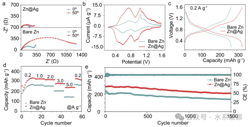 (a)第50次循环前后的电化学阻抗谱。(b)0.2-1.6 V电压窗下0.1 mV s-1的循环伏安曲线,(c)0.2 A g-1的充放电曲线。(d)Zn||V2O5和Zn@Ag||V2O5在2.0 A g-1下的速率性能和(e)长期循环性能。