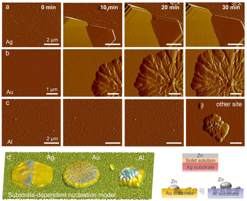 (a)Ag,(b)Au和(c)Al玻璃基电极上初始成核和早期生长的原位AFM图像。电流密度为40 μA cm-2。(d)Zn在Ag、Au和Al基体上的成核行为。