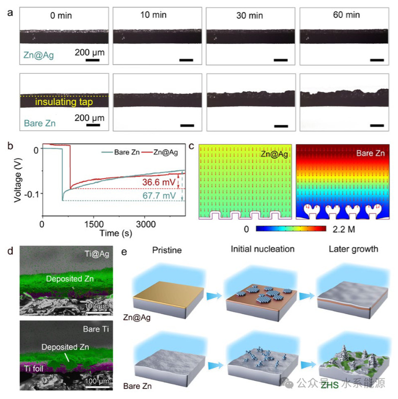 (a)Zn@Ag和裸锌电极上沉积Zn的原位OM图像。电流密度3.0 mA cm-2。(b)0.5 mA cm-2下Zn沉积的电压-时间曲线。(c)Zn@Ag和裸锌电极上沉积Zn的有限元分析模拟。渐变颜色对应局部Zn2+浓度。(d)Ti@Ag和裸Ti电极上元素映射的SEM横截面图像。(e)Zn@Ag和裸锌电极界面化学示意图。