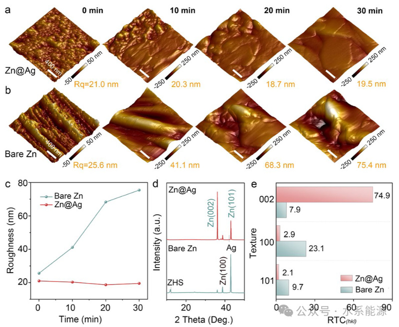 (a)Zn@Ag和(b)裸锌电极上初始成核和早期生长的原位三维AFM图像。电流密度为40 μA cm-2。(c)原位AFM试验中沉积Zn的粗糙度。(d)Zn@Ag和裸锌电极原位AFM测试后的XRD谱图,(e)不同晶面对应的RTC值。