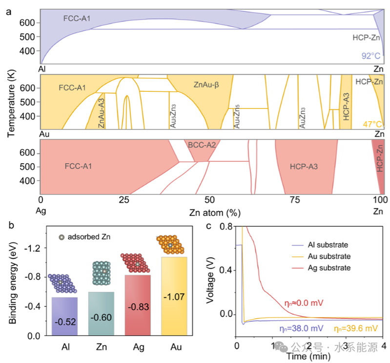 (a)Zn-Al、Zn-Au和Zn-Ag的相图。Al/Ag溶解在Zn中称为HCP-Zn。FCC、BCC和HCP分别缺少面心立方、体心立方和六边形密堆积。(b)锌原子在衬底上的结合能。(c)40 μA cm-2时基底上Zn沉积的电压分布图。