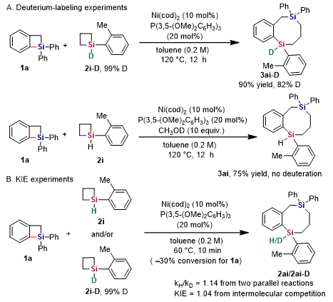 在完成底物扩展基础之上,作者开展了一系列控制实验,对该反应的反应机制进行了详细研究(图3)。控制实验发现,当硅杂环丁烷上不含H−Si 键时,该交叉环化反应不能反生,取而代之的是硅杂张力环自聚。氘代实验和动力学实验表明:1)反应中可能涉及H−Si 键的断裂和重新形成;2)H−Si 键的断裂和重新形成是一个分子内过程;3)H−Si 键的断裂不是决速步骤。