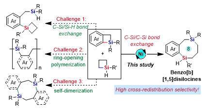 硅杂环是一类结构独特的有机硅化合物,在硅代药物研发中有着广泛和重要的应用价值。尽管对于硅杂环的合成最近取得许多进展,然而,目前仍然缺少在环上同时引入两个硅原子的行之有效的扩环方法。英国上市公司365赵东兵教授课题组提出是否可以通过精确控制催化条件和选择适当底物,实现不同含硅张力环上两个C−Si键的交换,从而一步构筑二硅碳环。然而,要实现两个C−Si键的交换扩环反应并不容易。在本项研究中,我们解决了包括1)硅杂张力环的自聚;2)硅杂张力环的开环聚合反应;3)C−Si/Si−H键交叉交换反应等挑战,利用镍催化剂,成功实现了苯并硅杂环丁烷与含硅氢键的硅杂环丁烷之间的扩环反应,构筑了各式各样的苯并二硅杂环。据我们所知,这是首例高选择性的C−Si/C−Si 键交换扩环反应。