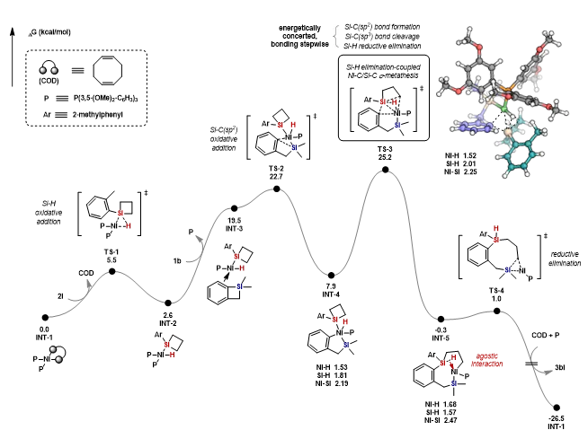 随后,作者对该反应的机制进行了DFT计算研究(图4)。结果表明,零价镍催化剂首先插入含硅氢键的硅杂环丁烷上的H−Si 键,随后发生苯并硅杂环丁烷上C−Si 键的断裂,生成相应的四价镍物种,紧接着通过关键过渡态TS-3,实现H−Si 键的重新形成以及镍碳键与硅碳键的复分解反应,形成中间体INT-5。在INT-5中存在明显的H−Si 键与镍金属之间的抓氢键,从而稳定了镍金属物种,使其不容易发生β-氢消除,取而代之的是发生还原消除,获得最终环状产物。