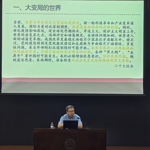 韩召颖从二十大报告和中央外事工作会议精神出发,分析了世界百年未有之大变局和中国特色大国外交的新阶段,通过对比分析,阐述了政治、经济、军事、科技等诸多领域的国际发展态势,深入浅出地阐释了习近平外交思想的主要内容。韩召颖指出,只有深刻理解构建人类命运共同体的根本理念,才能推动构建新型国际关系,为以中国式现代化全面推进强国建设、民族复兴伟业营造更有利国际环境、提供更坚实战略支撑。