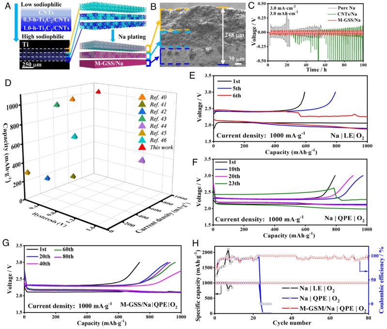 为了构建具有长循环稳定性的可充电Na-O2电池,设计并制备了M-GSS/Na。M-GSS由三层CNTs、0.3-h-Ti3C2/CNTs和1.0-h-Ti3C2/CNTs组成,如图5A所示。其中,0.3-h-Ti3C2/CNTs和1.0-h-Ti3C2/CNTs意味着h-Ti3C2与CNTs的重量质量比分别约为0.3和1.0。相应的EDX映射表明M-GSS可分为三层(图5A插图),这与亲钠性h-Ti3C2含量从表面到底部逐渐增加相对应。