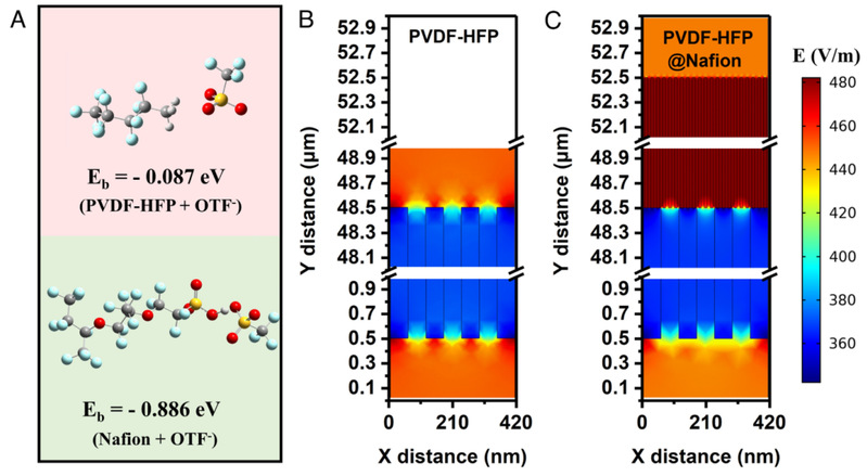 为了更深入地了解Nafion膜在PVDF-HFP@Nafion基电解质中的作用,进行了相关的DFT计算和有限元建模(FEM)模拟。图4A显示了OTF-与PVDF-HFP和Nafion之间的结合构型和结合能。结果表明,OTF-阴离子与PVDF-HFP段的相互作用较弱(-0.087 eV),而Nafion中的磺酸基团对OTF-阴离子具有较强的作用,结合能为-0.886 eV。因此,相对于纯PVDF-HFP,Nafion能更好地捕获阴离子,从而提高Na+阳离子的迁移次数。